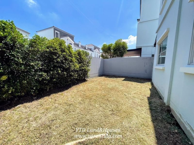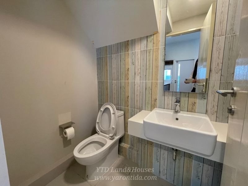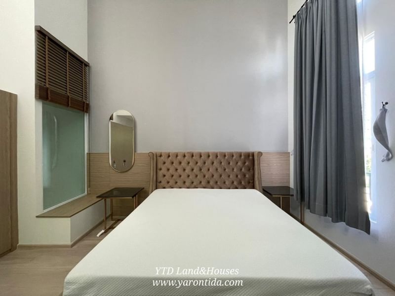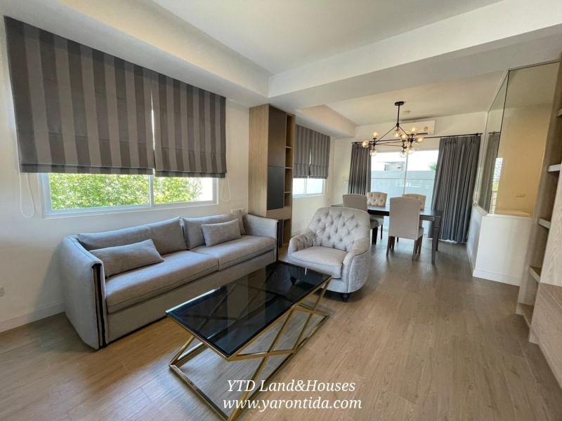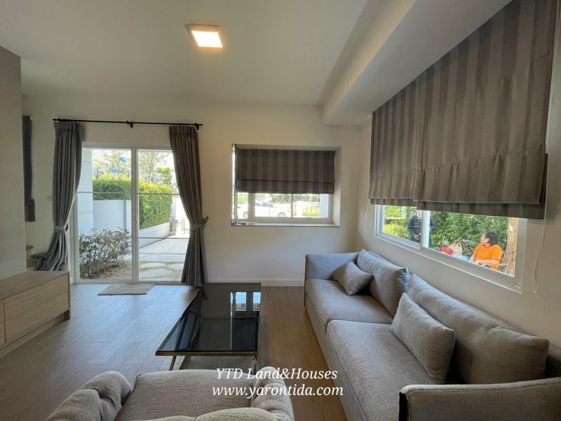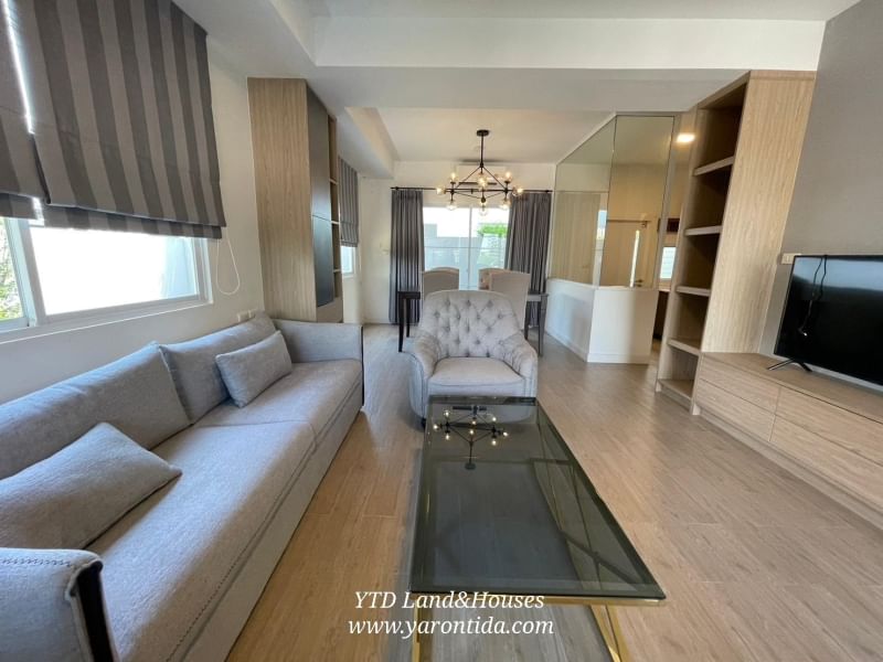 2-story townhome for rent, Indy Bangna – Ramkhamhaeng 2, near Mega Bangna. The best location in this area The front of the house faces east. The house has a corner plot. There is a mezzanine in the master bedroom. It is beautifully decorated and has an electric awning in front of the house. There is space on the side. Just a few steps from the clubhouse. There is a garden to provide shade. Fully furnished.