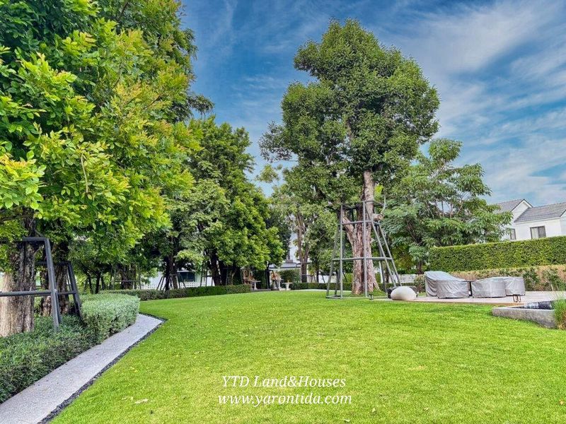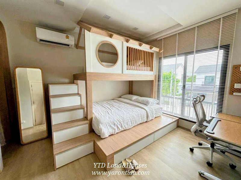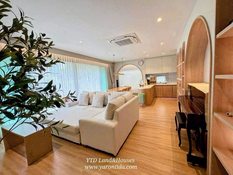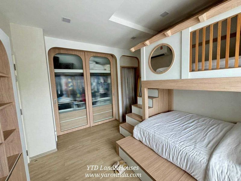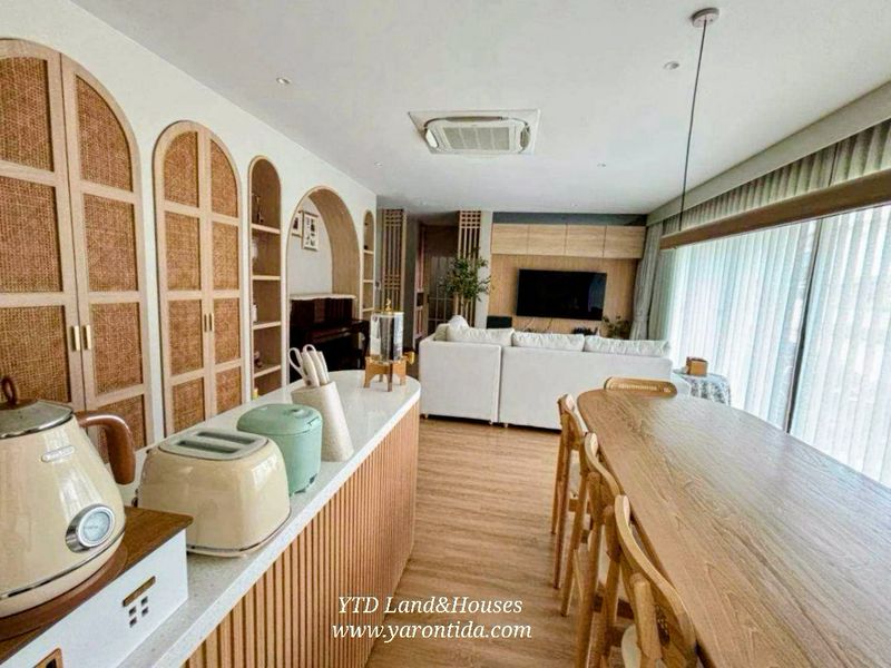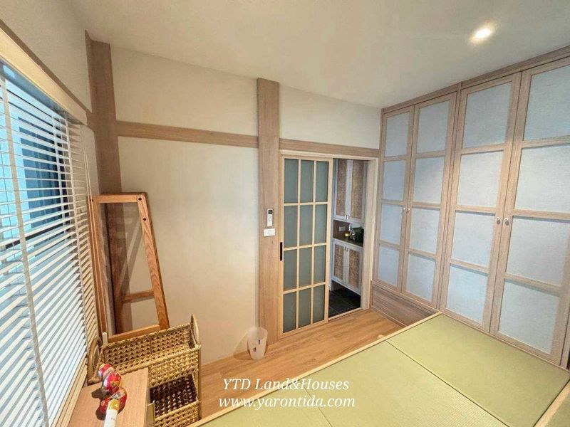 For rent 2-story detached house in the Pimnara Srinakarin-Bangna Modern Japanese Tropical house, another sustainable style, living with natural materials, beautiful and warm in the heart. The house is beautifully decorated, has a maid’s room, ready to move in.