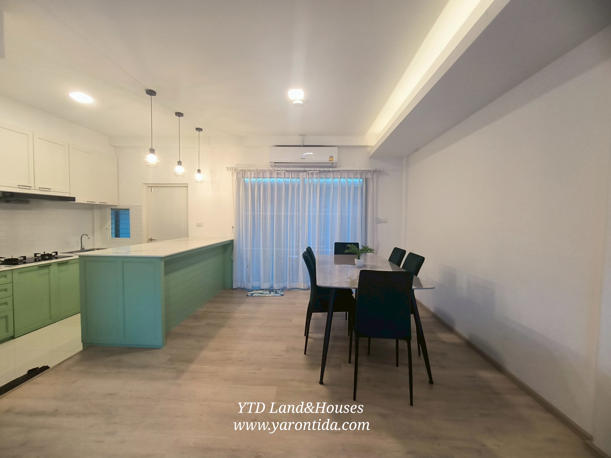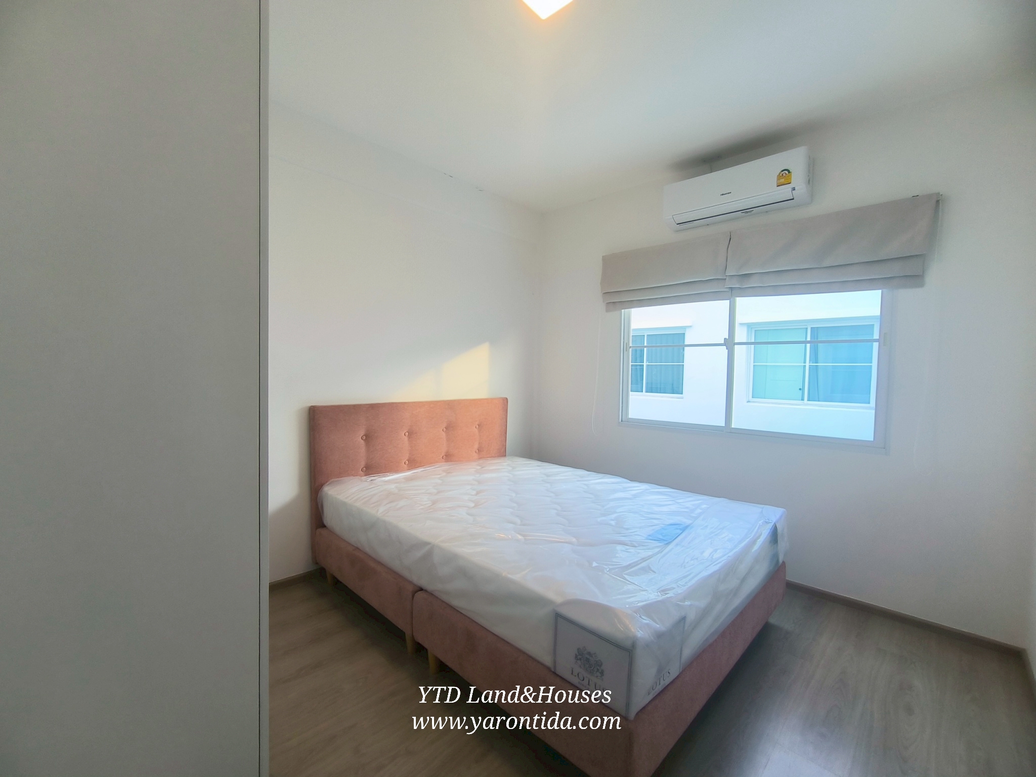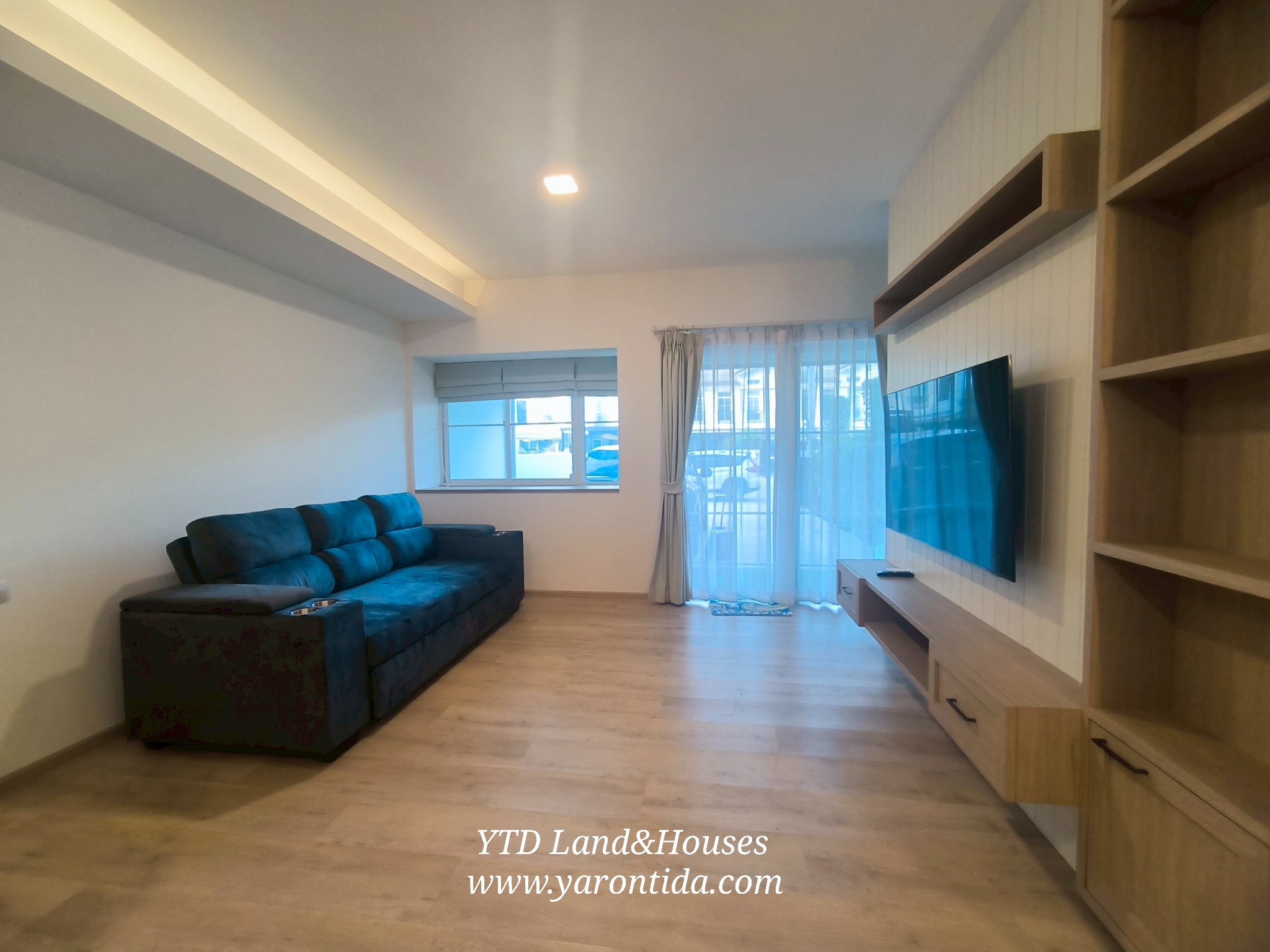 For rent 2-story townhome near Mega Bangna, best location in the area, Indy 2 Bangna-Ramkhamhaeng 2, the front of the house faces north, located on the main road, near the club, can park up to 4 cars, near both the club and the garden. The front has an electric awning. The back has a complete awning. Beautiful house. ready to move in.