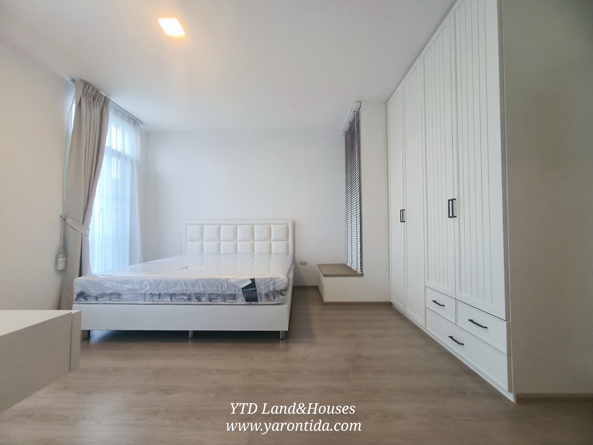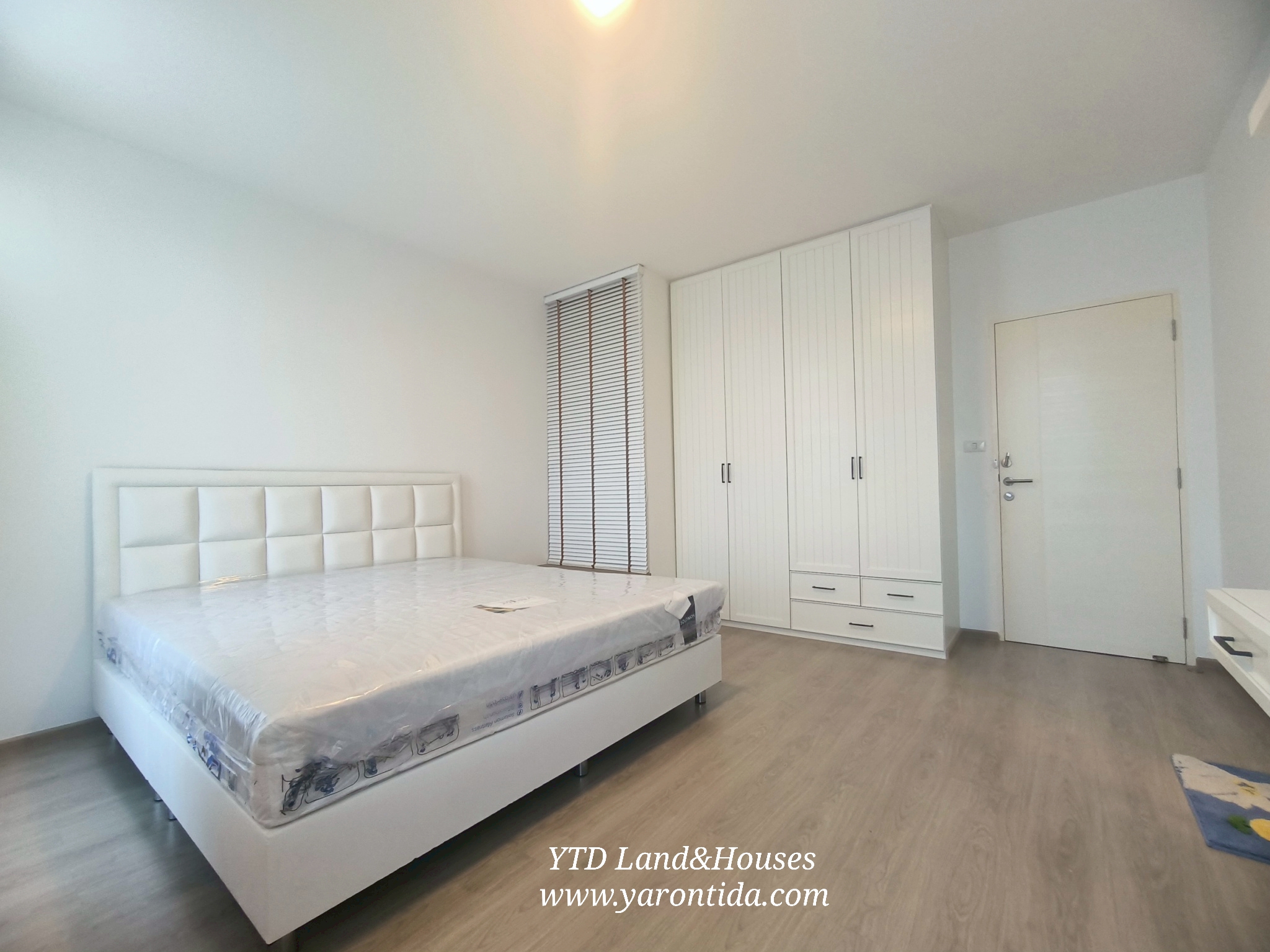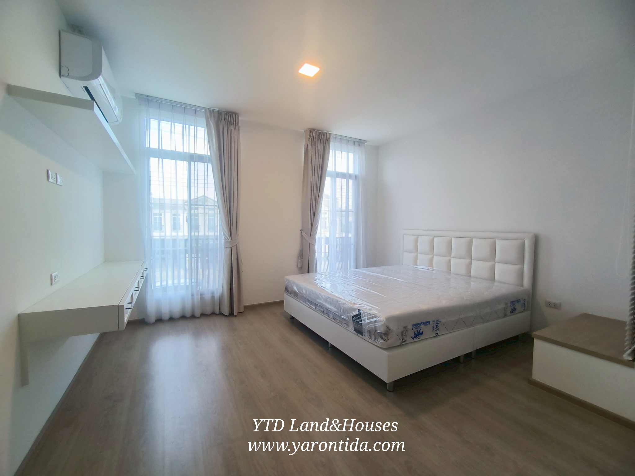 For rent 2-story townhome near Mega Bangna, best location in the area, Indy 2 Bangna-Ramkhamhaeng 2, the front of the house faces north, located on the main road, near the club, can park up to 4 cars, near both the club and the garden. The front has an electric awning. The back has a complete awning. Beautiful house. ready to move in.