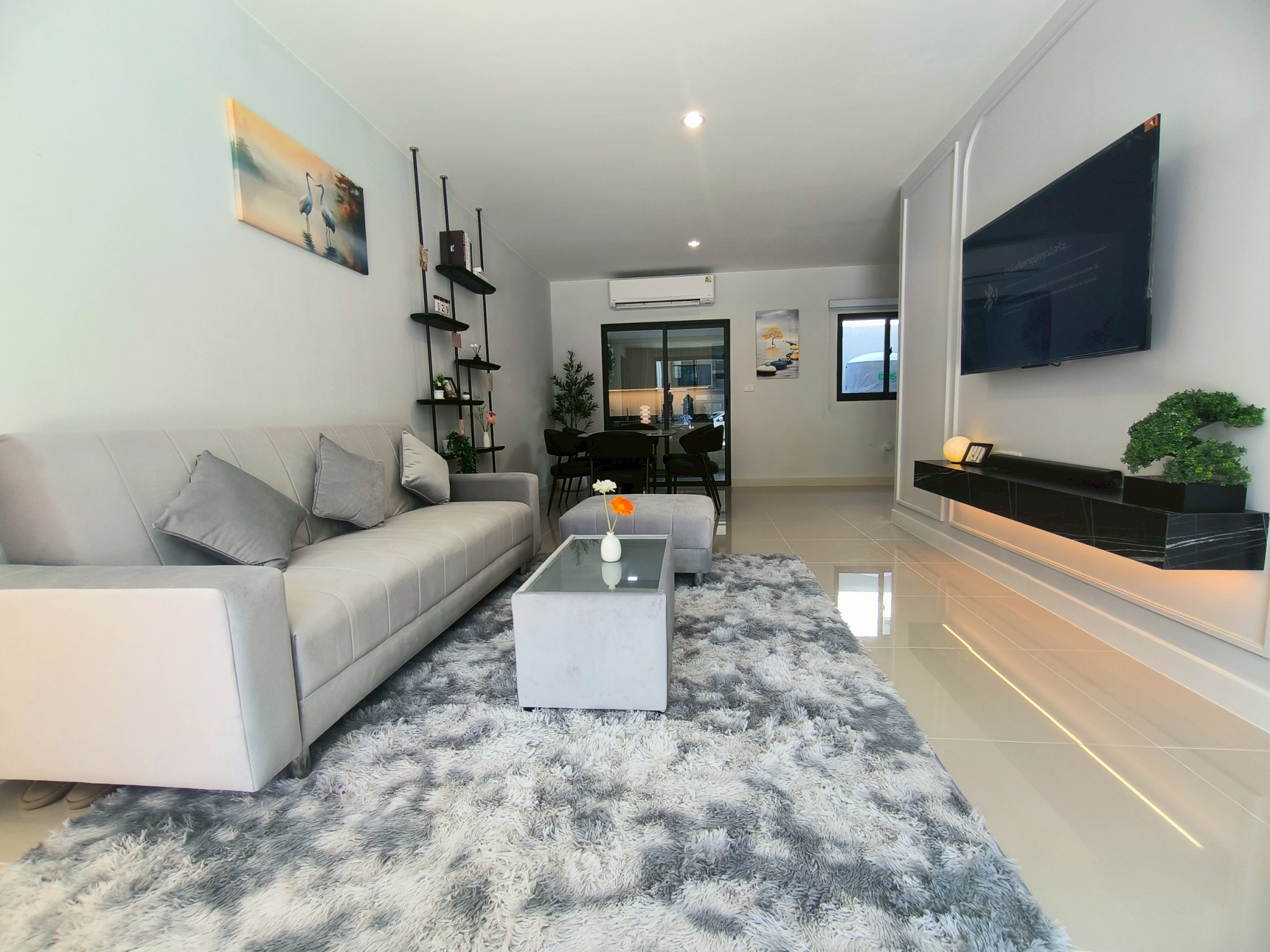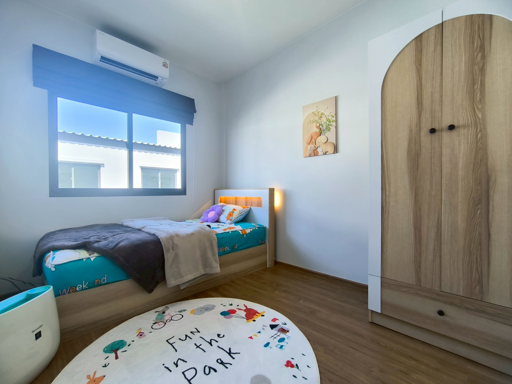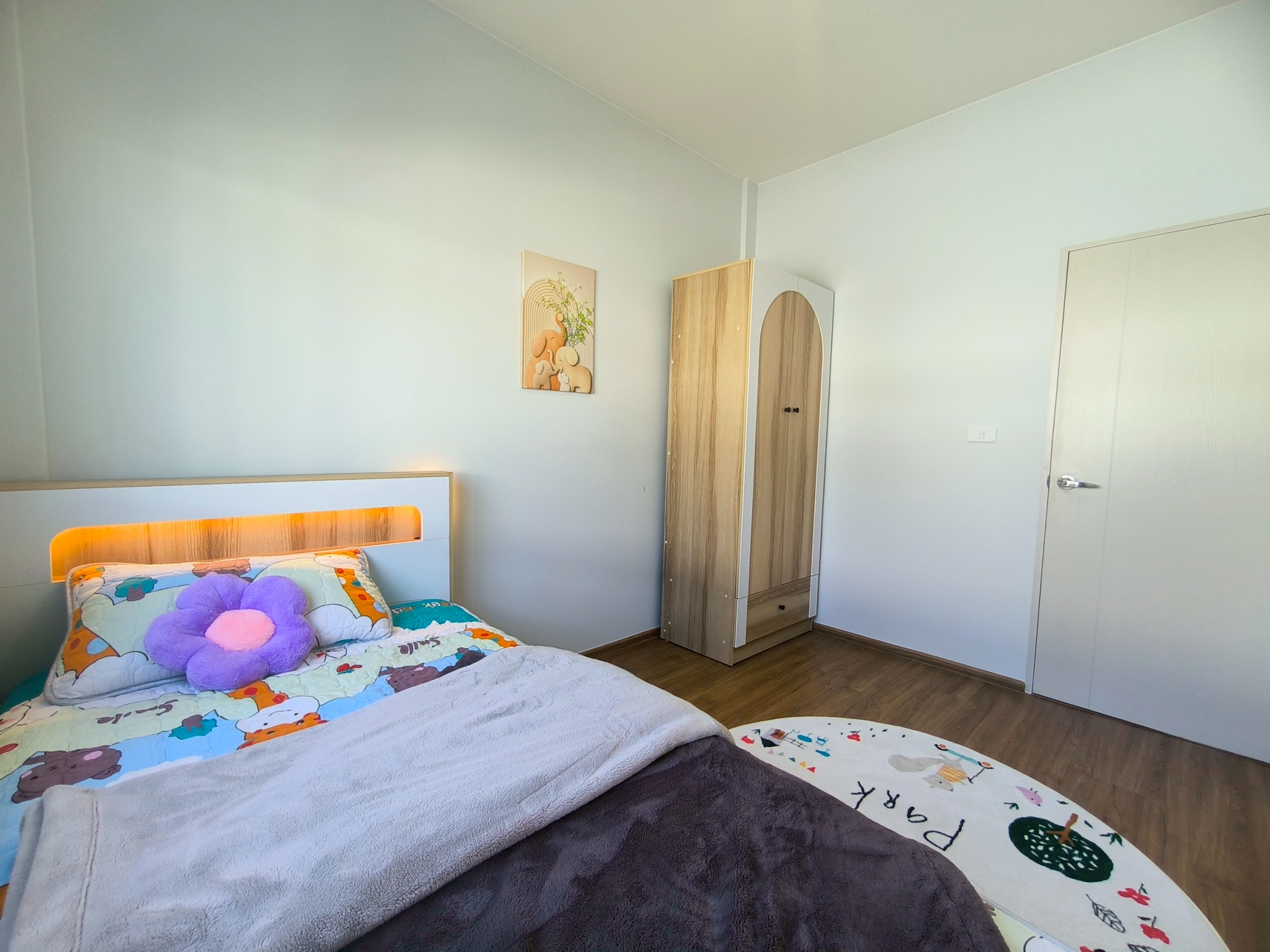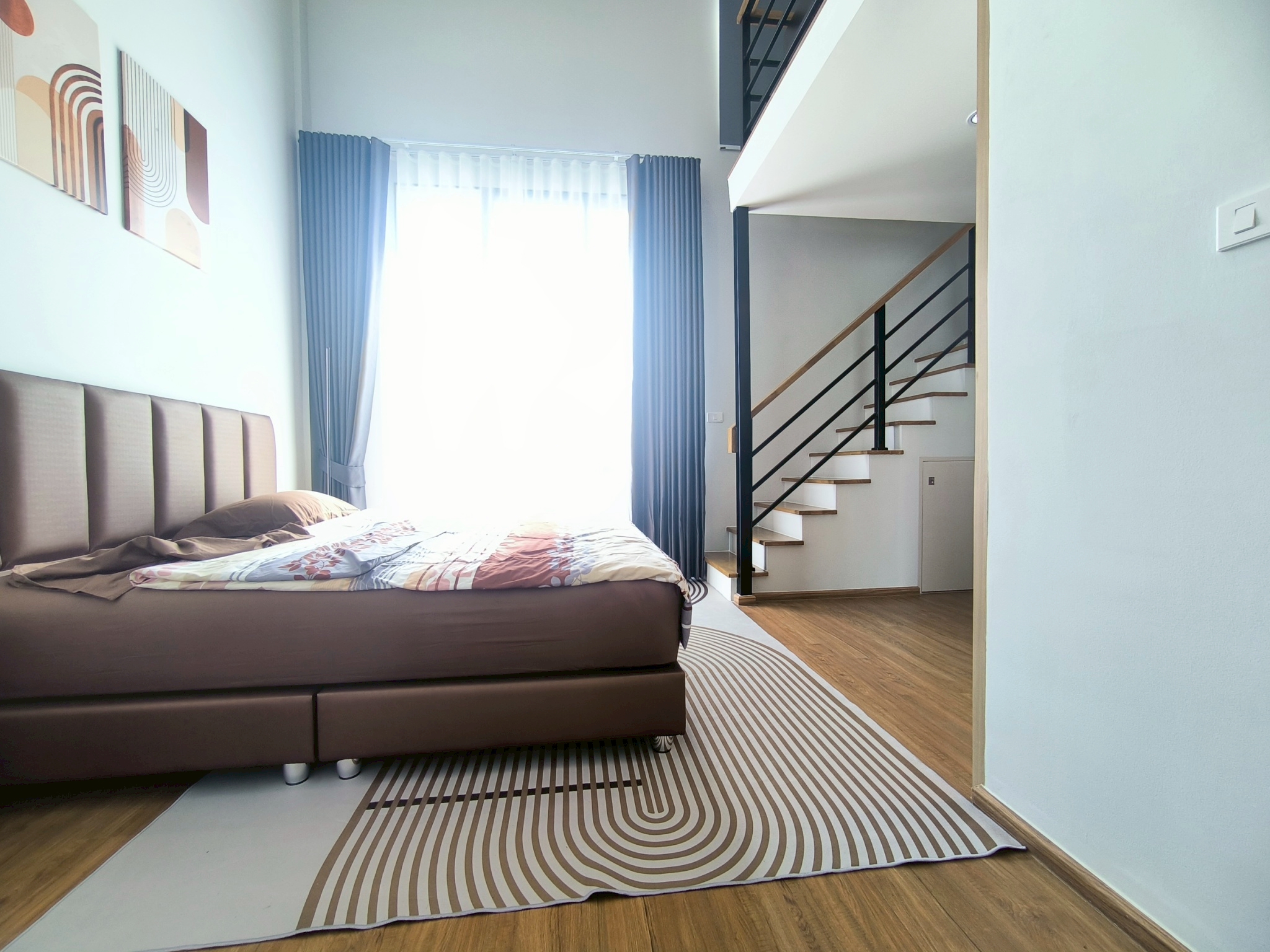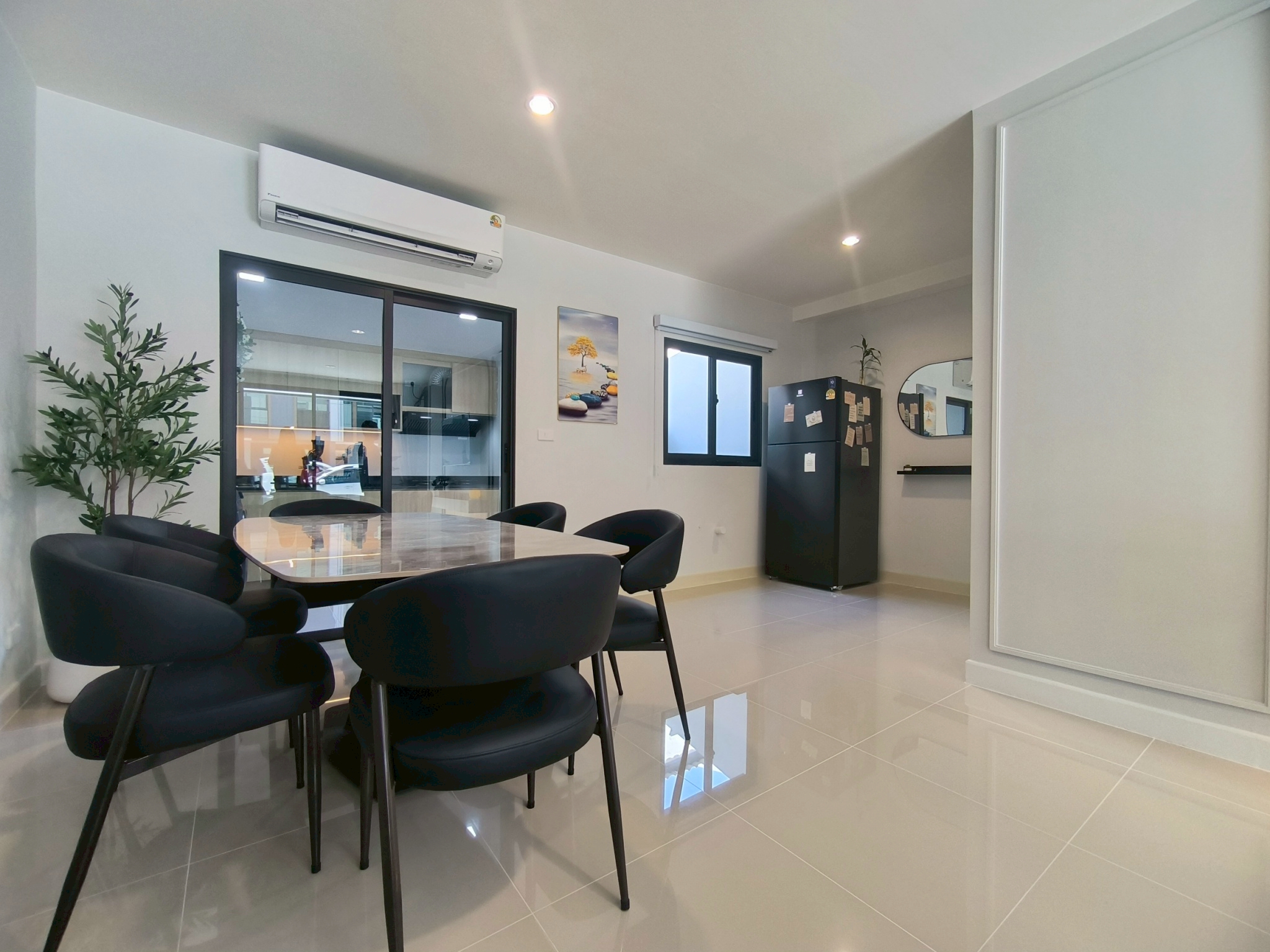 For rent 2 and a half story townhome, high-end home in the Pleno Sukhumvit-Bangna 4 project, located near Mega Bangna, only 800 meters away, and accessible by many routes, including Bangna-Trad and Buanakarin Road, Nam Daeng, and Theparak. The back has an extended roof and a kitchen, separated into kitchen and water pump areas, and a mezzanine in the master bedroom. Decorated with grade A furniture, a beautiful home ready to move into. This new home has never been lived in.