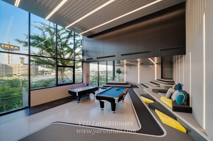 A Space Mega uses the Futuristic Modern Design style for the design of residential buildings. This style emphasizes the use of both straight and horizontal lines, combined with a variety of colors such as white, gray, and black. When combined, it becomes a beautiful and dimensional style. The building itself is L-shaped and uses a Double Wall structure. This type of project is not Precast, but rather a two-layer wall for every unit. This helps prevent noise and echoes well. It is also strong and has a long service life. In terms of the design of the living room, laminate flooring is used in both the living room and bedroom. The kitchen uses large black granite with a built-in kitchen counter and a black synthetic stone top. The atmosphere inside the room is airy with a 2.6-meter ceiling height and full-length glass doors and windows.